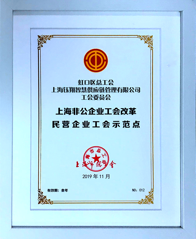 12月24日,上海市總工會(huì)召開(kāi)上海推進(jìn)非公企業(yè)工會(huì)改革工作現(xiàn)場(chǎng)會(huì),上海市一批“小二級(jí)”工會(huì)示范點(diǎn)、民營(yíng)企業(yè)工會(huì)示范點(diǎn)作為推廣先鋒隊(duì)在會(huì)上受到了表彰,上海鈺翔智慧供應(yīng)鏈管理有限公司工會(huì)被授予“上海非公企業(yè)工會(huì)改革民營(yíng)企業(yè)工會(huì)示范點(diǎn)”。