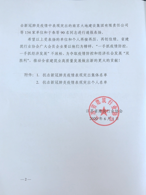 6月1日,江蘇省建筑行業協會發布《關于通報表揚江蘇省建筑行業協會抗擊新冠肺炎疫情表現突出集體和個人的通知》,對協會內抗擊疫情成績突出先進單位和個人予以通報表彰。在此次表彰中,鈺翔控股集團榮獲江蘇省建筑行業協會“抗擊新冠肺炎疫情表現突出集體”榮譽稱號。